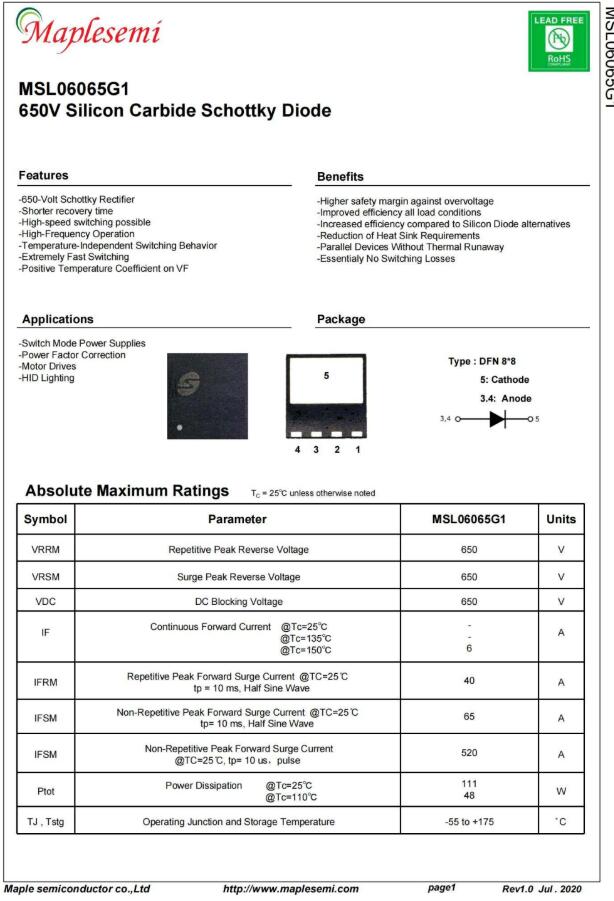 MSL06065G1碳化硅二极管耐压650V,150℃连续正向电流6A,工作温度范围-55到175℃,正向压降1.4V,并具有正温度系数特性,可直接并联使用。可应用于开关电源,功率因数校正,马达驱动和氙气灯照明应用。