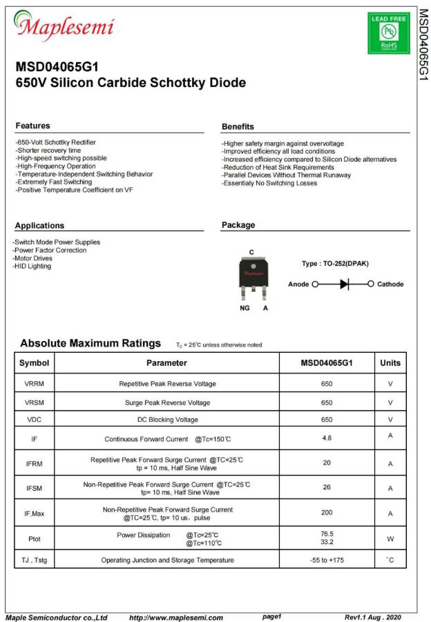 MSD04065G1碳化硅二极管耐压650V,150℃连续正向电流4.8A,工作温度范围-55到175℃,正向压降1.45V,并具有正温度系数特性,可直接并联使用。可应用于开关电源,功率因数校正,马达驱动和氙气灯照明应用。