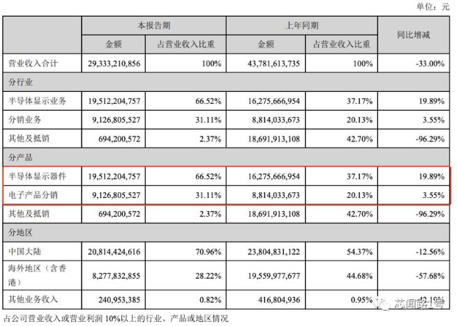 TCL科技在2020年上半年公布的营收情况中,半导体显示器件和电子产品分销营收较2019年上涨了19.89%和3.55%,TCL华星实现产品销售面积 1,420 万平方米,同比增长 47.9%,实现营业收入 195.1 亿元,同比增长 19.9%,受显示面板价格处于历史低位以及应对疫情防控措施升级带来的一次性支出的影响,TCL华星报告期亏损 1.33亿元。