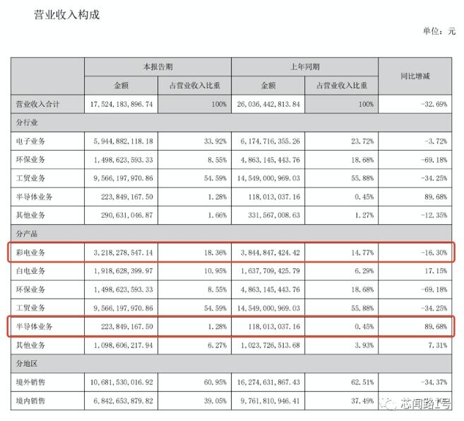 康佳集团在2020上半年财报显示,其半导体业务和白电业务在2020年上半年同比2019年分别上涨了89.68%和17.15%,彩电业务和环保业务大幅下降。其中营收比重还是以工贸业务占主要营收。