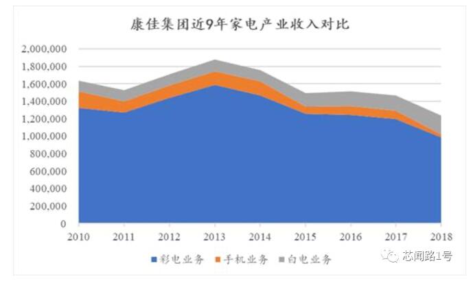 2011年开始,康佳集团的扣非净利润常年处于亏损状态。以彩电起家且占据半壁江山的康佳集团,整体家电业务陷入“双不增”局面(不增收、不增利)。白电业务因收购新飞得以维持增长;手机与彩电业务收入下降态势显著,2018年手机与彩电业务收入同比分别下降63.94%、17.53%。
