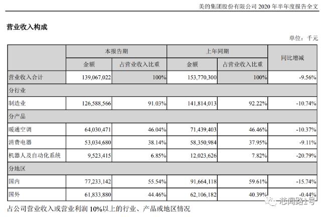 美的2020年上半年的财报数据显示,暖通空调和消费电器是美的的主营业务,其营业收入合计与2019年同期下降了9.56%,暖通空调、消费电器分别下降了10.37%和9.11%。