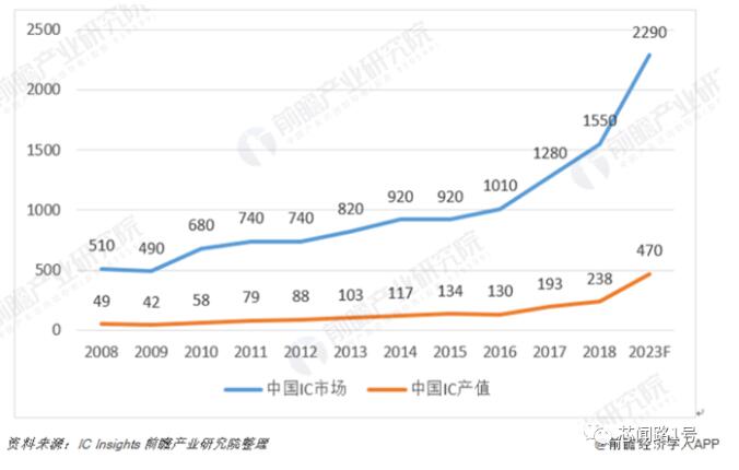 图:2008-2023年中国IC市场和中国IC产值趋势(单位:亿美元)