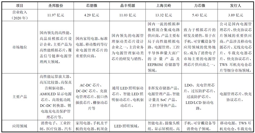 电源管理芯片因为是通用器件,而且设计和制造工艺技术相对成熟,因此这一市场的国产芯片厂商很多(跟MCU市场类似),下表将英集芯(表中发行人)与其它已经上市的五家国产电源管理芯片公司进行了对比。