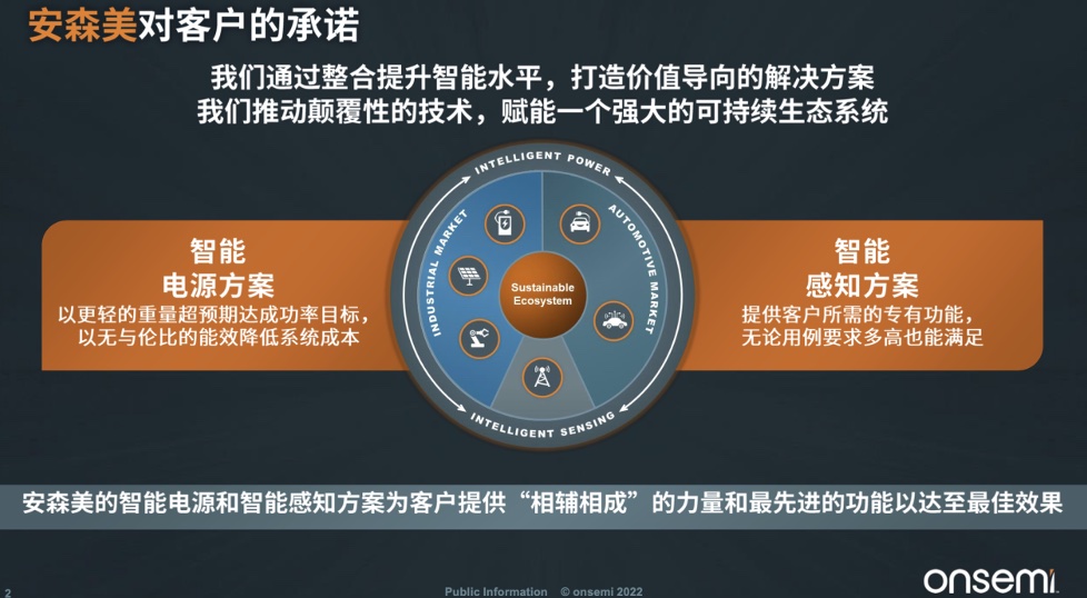 两大支柱:一个是智能电源方案;一个是智能感知方案。智能电源方案以更轻的重量、更高的能效帮助客户节省成本,实现更高的功率目标,可以应用于电动车这样的广阔场景;智能感知方案方面,安森美有很多专用集成功能,可以满足客户的严苛要求。