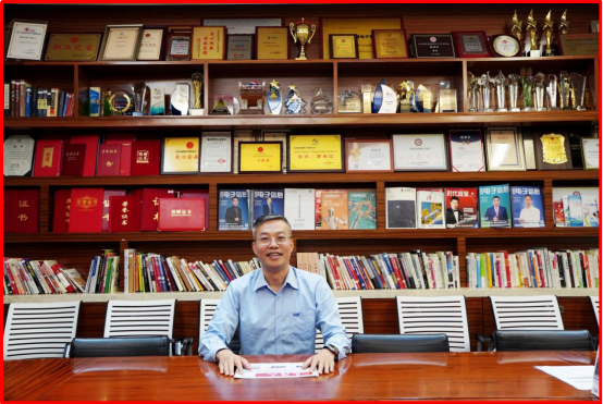 陈总身后一整面墙的书籍刊物、奖杯证书