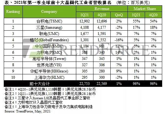 TrendForce集邦咨询研究显示,受惠于多项终端应用需求齐扬,各项零部件备货强劲,晶圆代工产能自2020年起便供不应求。2021年第一季度,全球前十大晶圆代工业者总产值仍再次突破单季历史新高。