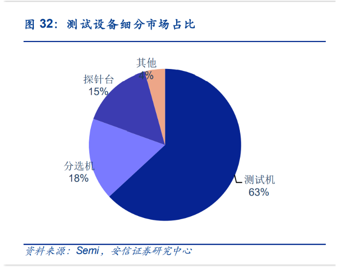 后道测试设备主要分为探针台、分选机、测试机(ATE),三者中,测试机市场最大,价值量更高。