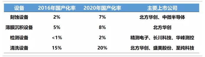 综合考虑国产化率、市场规模、是否上市等因素,刻蚀、薄膜沉积、检测、清洗这四大设备存在投资价值。