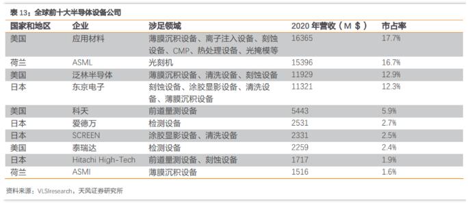 半导体设备这边,美国除了光刻机之外,在薄膜沉积、检测、刻蚀机、清洗机、离子注入等设备上都有很强的优势,全球前十大半导体设备公司中,美国占据了四席。