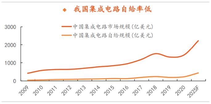 制造产能不足,极大制约国内芯片产业的发展,2020年我国集成电路供给量为227亿美元,需求量为1430亿美元,自给率仅为15.9%。
