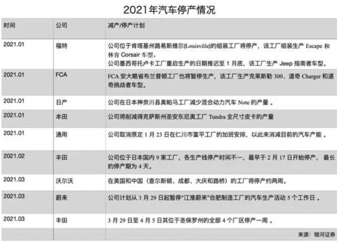 此后至今,这份因缺芯停产的“名单”越拉越长,本田、日产、FCA、通用、戴姆勒等多家国际巨头先后宣布停产/减产计划。