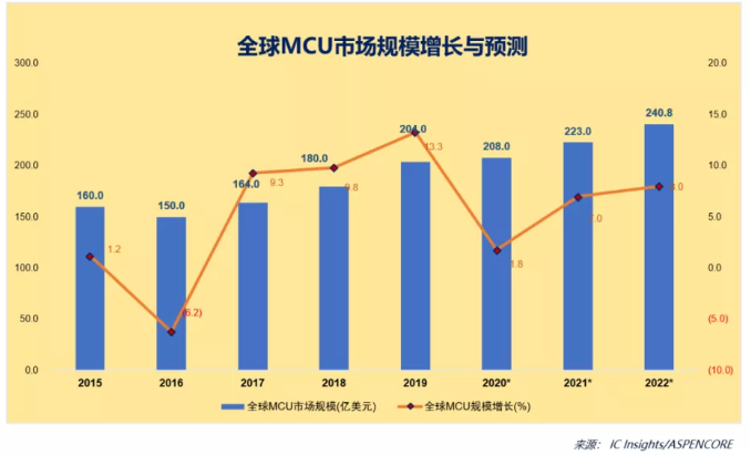 据IC Insights显示,2019年全球MCU市场规模约为164亿美元,到2023年可达200亿美元左右;而国内MCU市场2019年规模约256亿元,占全球市场26%左右,其中2015-2019年复合增长率CAGR达到了9%,是同期全球CAGR的4倍。
