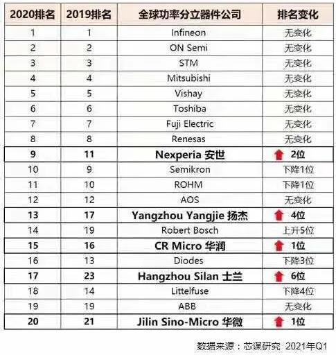 在新兴应用需求及政策的支持推动下,国内功率器件近年来发展也是相当迅速,据芯谋研究统计,中国企业有5价进入全球前20名,其中安世半导体更是进入前十,位居第九。
