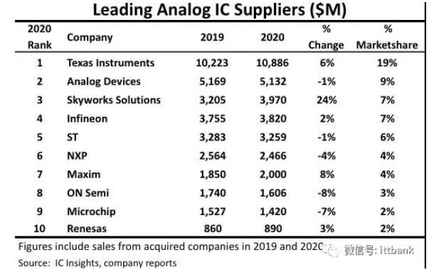 每年的5~6月间,IC Insights都会按照各大公司的财报,总结出上一年度的全球模拟IC厂商销售额排名。