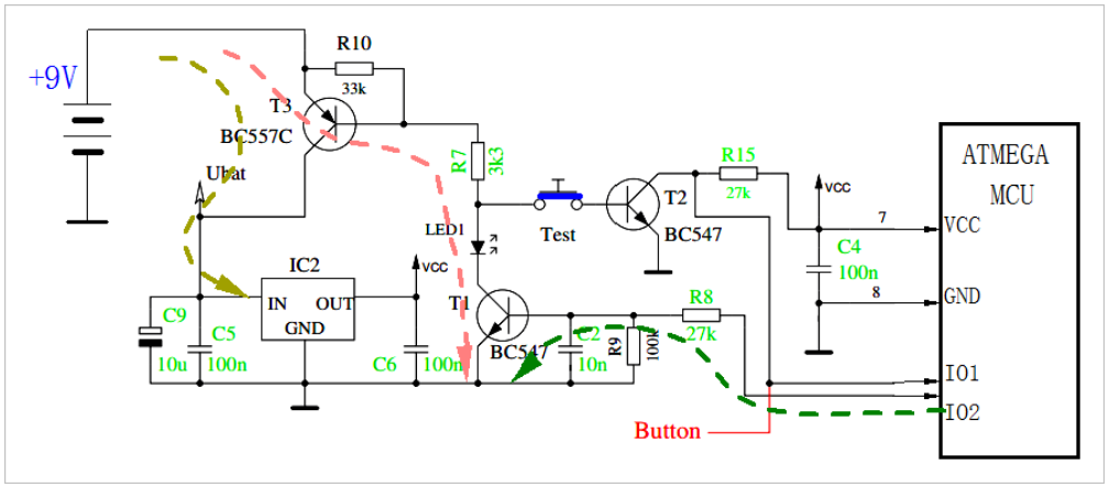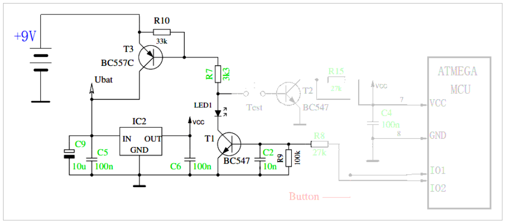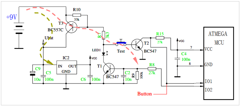 按动按钮“TEST”启动电路,T3的基极通过R7,Test,T2的b-e接地,从而使得T3导通。此时+9V通过T3加到IC2稳压芯片。IC2输出VCC是加到单片机上。