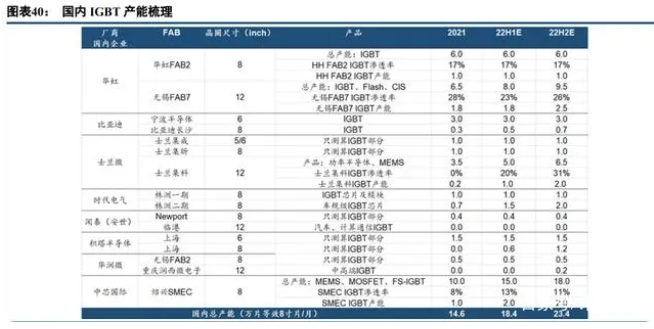 我们认为市场对于 IGBT 芯片供给大幅开出以后导致 IGBT 芯片市场竞争加剧的担忧大可不必,我们梳理 了国内明年新增的 IGBT 产能,如果拉平 2022 年全年的 IGBT 供应增量,预计为 5.04 万片/月,如果考虑良率 等问题,预计实际产能不足 4 万片/月,对于明年 200 万辆电动车的 IGBT 芯片消耗量就达到 2-3 万片/月,如果 再考虑光伏和风电等领域用到的 IGBT 芯片,预计产能供应相对偏紧张。