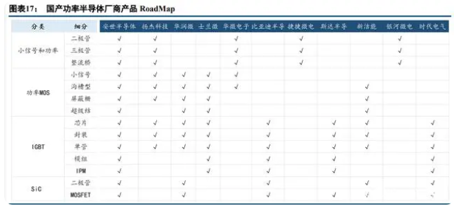目前国内功率半导体厂商众多,产品线差异也比较大,营收规模较大的厂商主力产品是 MOSFETs,随着电 动车和光伏、风电等新能源发电领域对于 IGBT 的大幅需求增长,各个厂商开始逐步将产品线扩展至 IGBT,部分龙头厂商已经开始布局第三代半导体 SiC 衬底的功率 MOSFET。根据我们的统计,目前国内在功率半导体产品布局最完善的厂商是闻泰科技旗下的安世半导体,首先公司 主力产品线覆盖了晶体管(包括保护类器件 ESD/TVS 等)、Mosfet 功率管、模拟与逻辑 IC 三大领域,小型号 MOSFET 居于全球排名第二,公司汽车类 POWER MOSFET 预计市场地位仅次于英飞凌。其次公司通过提高研 发投入进一步加强了在中高压 Mosfet、化合物半导体产品 SiC 和 GaN 产品布局,同时收购英国 Newport 晶圆厂 100%股权,获得了 4000 片/月的 IGBT 产能,目前公司汉堡工厂已经开始搬入碳化硅设备,预计 SiC MOSFET 新品在 2022 年量产。