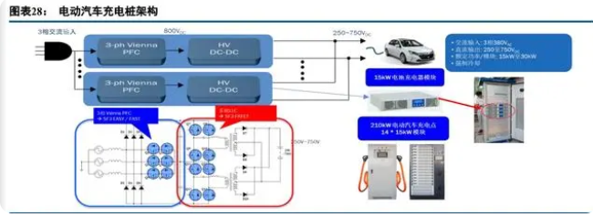 Vienna 整流+LLC 构成了充电桩的基本电路。如果考虑设备成本,使用 Si 基 IGBT 和超级结 MOSFET、 FRD(快恢复二极管)方案更具成本优势;如果需要高功率密度和高效率,碳化硅 MOS/SBD 方案更具性能优 势。PFC 部分更适合使用碳化硅器件,理由有二:其一,高温时导通电阻增加较少,能实现高效率,同时可抑 制发热,使用更小的散热板;其二,碳化硅器件的恢复损耗非常小,开关损耗较小,能够提高工作频率,有助 于输入线圈的小型化。作为硅器件解决方案,Si 基的超级结 MOS 和 IGBT 也是不错的替代方案。价值量方面, 慢充 20KW 以内用半桥工业 IGBT,单桩价值量在 200 元以内,如果采用超级快充 100KW 以上,超大功率的充 电桩会采用 SiC 方案,成本会成倍增加,整体价值量会提升至 1000 元以上。