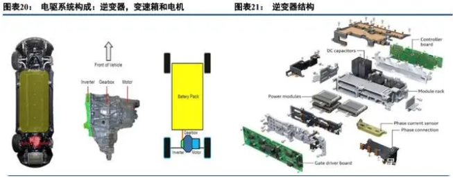 电驱系统是纯电汽车的核心,可以理解为传统燃油车的发动机,主要包含了逆变器(Inverter),减速器 (Gearbox)和电机(Motor)。逆变器中的电子电力控制器件如 IGBT/SiC MOSFET 将电池中的直流电转逆变为交 流电传送到三相电机,电机从 0rpm/min 开始输出峰值扭矩,但当电机转速高于恒扭矩区间时,电机扭矩就会有 所下降,所以这时就需要减速器的介入,减速器通过多级齿轮的传动即可实现降低转速、提升扭矩的效果,从 而满足车辆高速行驶时对扭矩的需求。电驱系统未来的发展趋势是高度集成化,目前主流的电驱采用三合一的 集成电驱,如果按照 2021 年 340 万台电动车的出货量测算,我们预计国内电驱市场容量为 221 亿元左右。