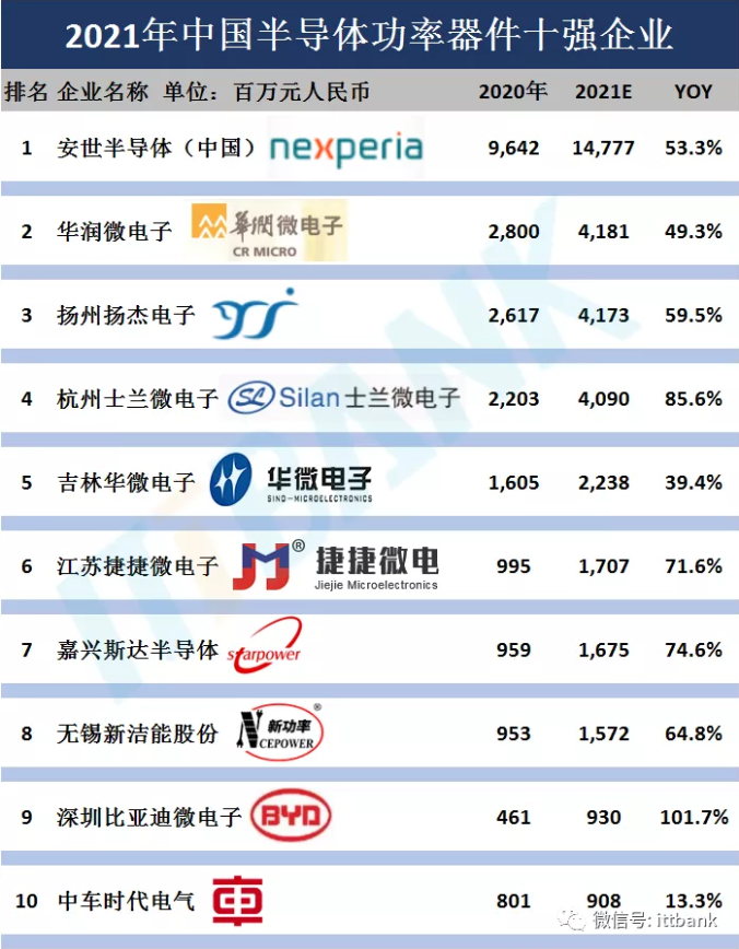 我国本土 IDM 厂商中功率半导体营收规模最大的厂商是华润微电子,2020年公司功率半导体营收达到 28 亿元,预计 2021 年营收同比增长 49.3%,超过 41 亿元人民币。Fab-less 模式为代表的 MOSFET 厂商无锡新洁 能和 IGBT 模组厂商嘉兴斯达半导在2021 年实现了更快的成长,2021 年营收两者预计将分别大增 64.8%和 71.6%。前十大国内功率半导体厂商 2021 年营收规模合计达到 362.5 亿元,同比成长57.4%,相较于国内集成电路产业 2021 年前三季度 16.1%的成长速度,显示了功率半导体产业超预期的复苏态势。
