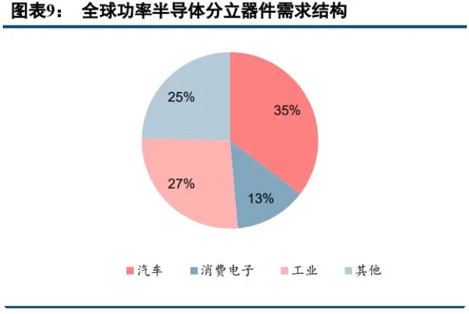 全球功率半导体行业市场规模在 2019 年达到 464 亿美元,相较于上一轮高景气周期的 2018 年同比下滑 3.53%。2020 年和 2021 年在疫情影响全球进入“居家办公模式”,服务器和 PC 的强劲复苏叠加高景气的电动车 和新能源发电需求刺激,功率半导体行业迎来拐点。SIA 预计 2021 年全球半导体的销售额将达到 5530 亿美元, 创下新高,同比增长 25.6%,全球功率半导体龙头厂商英飞凌 Infineon,恩智浦 NXP,意法半导体 STM,安森 美 ON semi,2021 年前三季度分别成长 32.5%,31.43%,31.8%和 28.5%,我们预计全球功率半导体的行业增速 预计在 2021 年有望达到 30%,市场规模将接近 600 亿美元。从全球功率半导体分立器件需求结构来看,汽车是 需求最大的领域,占比达到 35%,其次是工业和消费电子领域,需求占比分别为 27%和 13%。
