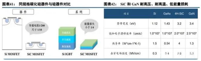 相同规格的碳化硅基 MOSFET 和硅基 MOSFET 相比,导通电阻降低为 1/200,尺寸减小为 1/10;相同规格的 使用碳化硅基 MOSFET 的逆变器和使用硅基 IGBT 相比,总能量损失小于 1/4。由于碳化硅器件具备的上述优 越性能,可以满足电力电子技术对高温、高功率、高压、高频及抗辐射等恶劣工作条件的新要求,从而成为半 导体材料领域最具前景的材料之一。具体对比如下: