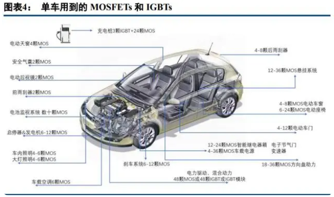 传统燃油车中仅有少量的 IGBT 单管用于发动机点火器,纯电汽车的动力系统转为电池以后,IGBT 模块成 为电驱系统中逆变器的标配,此外新能源汽车在车载充电机(OBC)、DC-DC 升压器、电空调驱动也需要用到 IGBT 单管。根据产业链调研与我们测算,四驱版本的纯电车型前后双电机各需要 18 颗 IGBT,车载充电机需要 4 颗,电动空调 8颗,合计一台电动车需要 48 颗 IGBT 芯片。