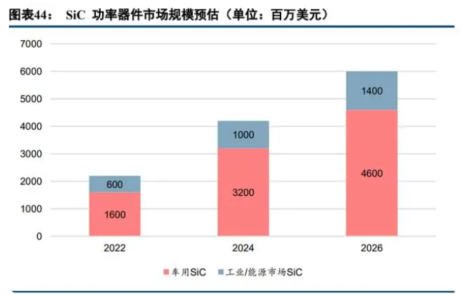 新能源汽车系统架构中涉及到功率半导体应用的组件包括:电机驱动系统、车载充电系统(OBC)、电源转换系统(车载 DC/DC)和非车载充电桩。碳化硅功率器件应用于电机驱动系统中的主逆变器,能够显著降低电 力电子系统的体积、重量和成本,提高功率密度。Wolfspeed 预计 2026 年车载 SiC 市场规模将从 2022 年的 16 亿美元增加至 2026 年的 46 亿美元。