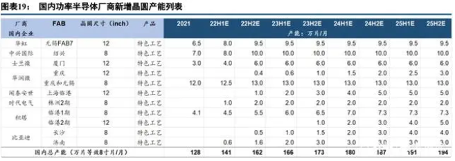 比亚迪作为国内电动车的龙头企业,旗下比亚迪半导体在 2008 年收购宁波中玮的 IDM 晶圆厂开始进入 IGBT 芯片产业链,2012 年导入比亚迪电动车,2015 年自研 IGBT 开始上量,2020 年宁波产线具备 40 万 套电动车 IGBT 模块的配套能力,2021 年收购济南富能 8 寸产线,新增年产能可配套新能源汽车需求约 90 万辆,合计配套 130 万量。