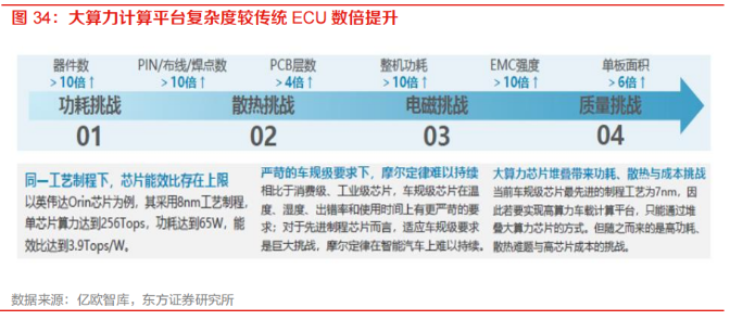 2、功耗:为支持并兼容 L3 及以上智能驾驶系统数量与类型繁多的传感器与执行器需求,车载计算平台多采用异构芯片硬件方案,以满足系统接口与算力需求。相较传统 ECU,车载计算平台的复杂度呈数倍提升,面临功耗、散热、电磁、质量等多重挑战,存在着物理上限。因此,尽管当前行业普遍以“TOPS” 为单位来评估自动驾驶芯片的理论峰值算力,各大芯片厂商也不断刷新算力峰值,但在实际场景下的算力有效利用率却不高,自动驾驶芯片理论峰值算力并不一定能在实际运行中完全释放,主要是受到了功耗、环境等因素的限制。