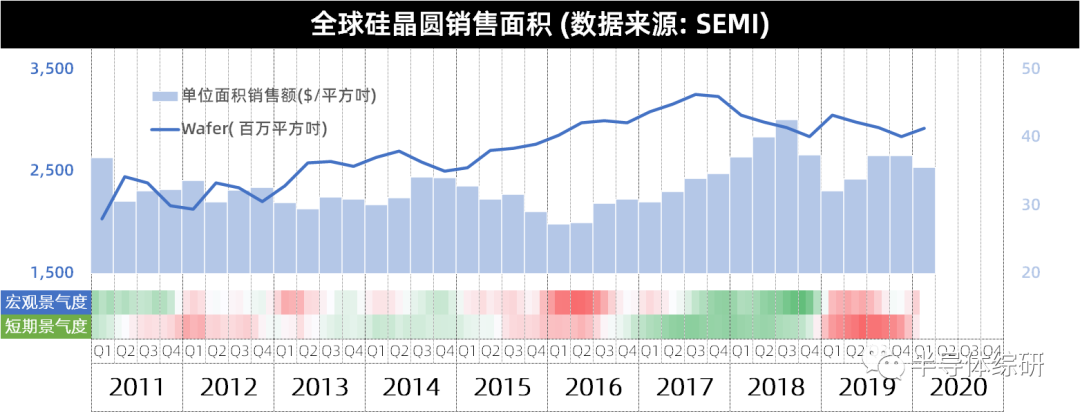 另外,SEMI最近也公布了2020年1季度,全球晶圆出货面积的数据。从数据上看,晶圆出货呈现小幅反弹趋势,但单位面积对应的半导体销售额则在下降,这有可能意味着全球整体半导体产品的毛利率在下降
