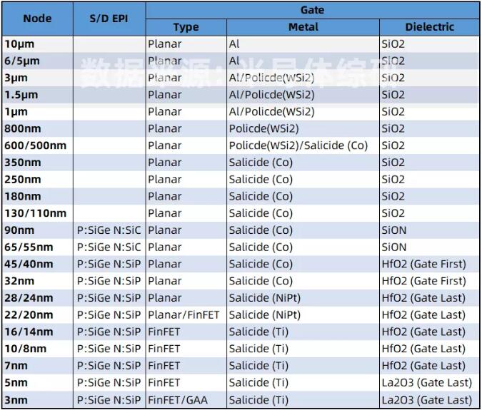 对于多数人而言,代表半导体工艺水平的线宽尺寸自然耳熟能详,但是随着电路图形的不断缩小,各种新的技术和材料、甚至晶体管本身的结构也发生着变化。为了方便大家参考了解,我特地查找资料并咨询行业专家,整理了一个制造工艺演进表欢迎大家参考和分享