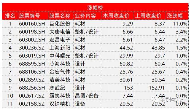 本周相对前期涨幅超过10%的股票只有一支巨化股份(600160.SH),也是唯一一支超过5%的;