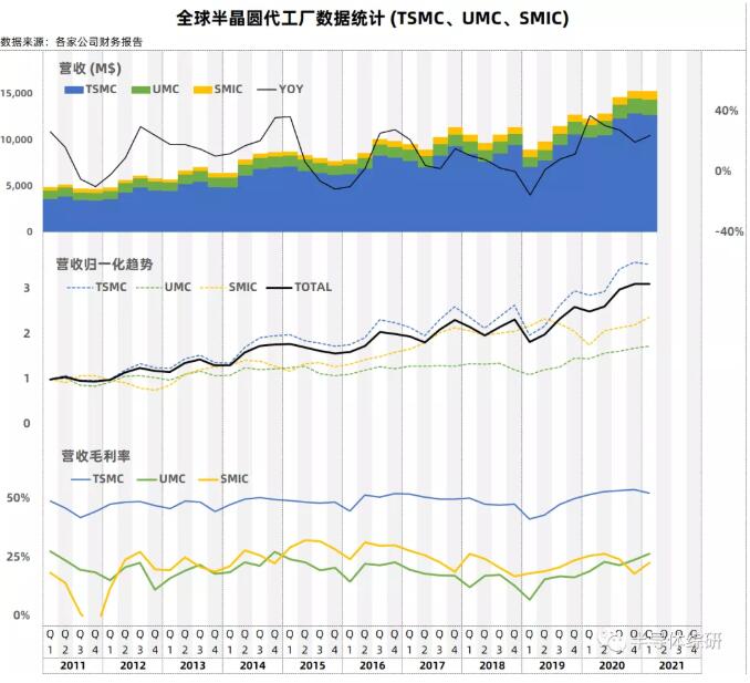 从晶圆出货量上看,三家都是持续增长,但区别在于TSMC的单位晶圆价格持续增长,而其它两家的价格却始终在下降