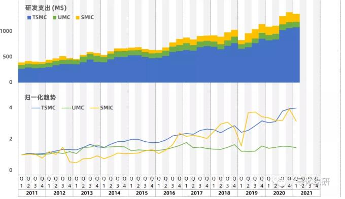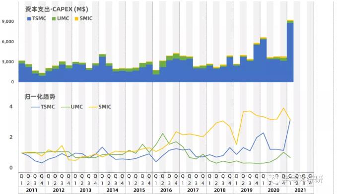 在产能扩张方面,TSMC在1季度的资本支出暴增,高达88.4亿美金,产能扩张速度让人惊叹;同时从归一化趋势上看,SMIC在最近4~5年也是大手笔持续扩张;而UMC最近几年都显得比较保守,只在最近两个季度略有回升