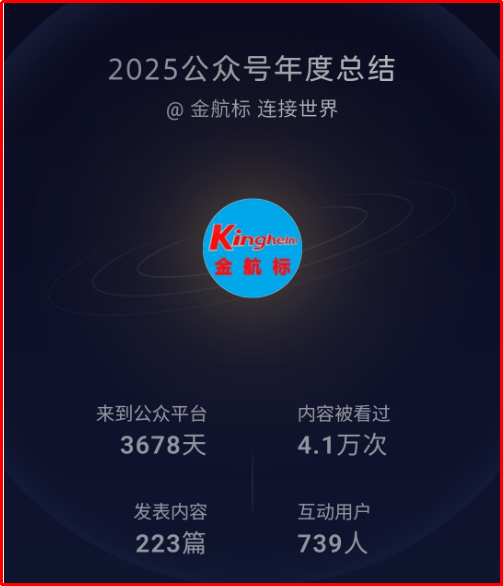 5、“金航标 连接世界”公众号运营10年距今3678天,其2025年创作成果稳中有升:全年活跃259天,发表文章223篇,共31.5万字,被看过4.1万次,共1.4万人!总关注数为2091,年度收获关注245,互动用户739人,转发1万次!
