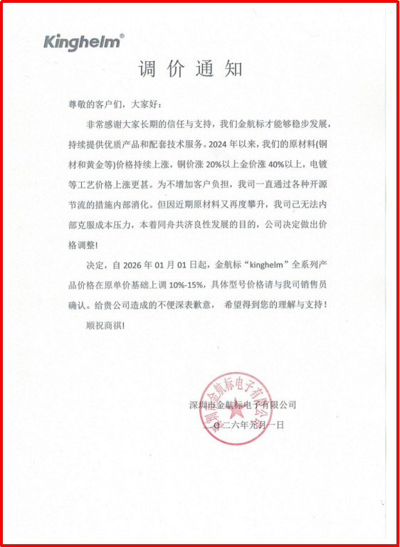 金航标产品调价通知:2026年1月1日起全系列上调10%-15%(萨科微1月7日每日芯闻)