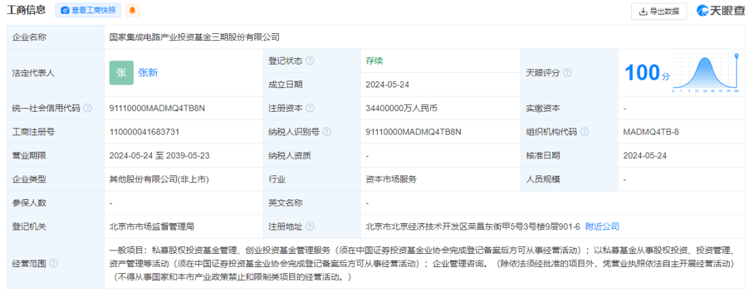 5月24日,国家集成电路产业投资基金三期股份有限公司成立,法定代表人为张新,注册资本3440亿人民币,经营范围为私募股权投资基金管理、创业投资基金管理服务,以私募基金从事股权投资、投资管理、资产管理等活动,企业管理咨询。