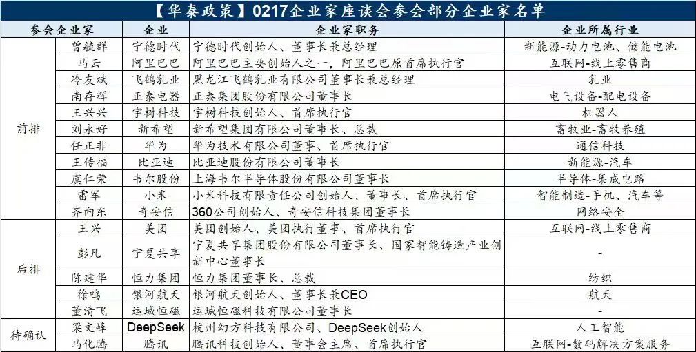 据新华社报道,2月17日上午,民营企业座谈会在北京召开。 根据央视新闻视频报道画面及其他权威媒体报道,出席座谈会的著名企业家包括华为创始人任正非、比亚迪董事长王传福等。 值得一提的是,若是将主业限定为集成电路行业,那目前看到与会嘉宾中只有韦尔股份董事长虞仁荣在圈定范围当中,若是将范围放宽为公司业务囊括或触及集成电路行业,那名单中的企业家除了前述三位之外,还包括阿里巴巴创始人马云、小米