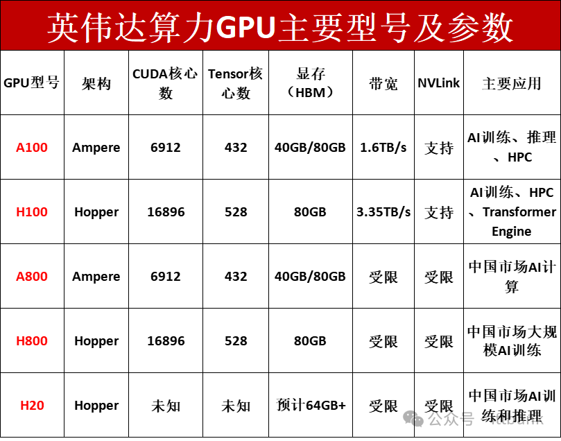英伟达算力GPU主要型号及参数