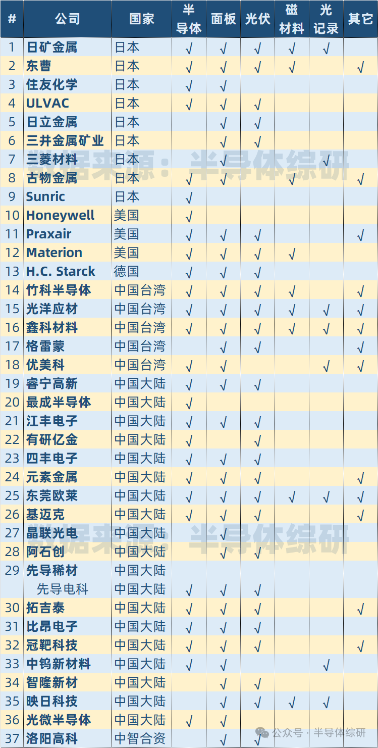 全球半导体相关溅射靶材供应商统计