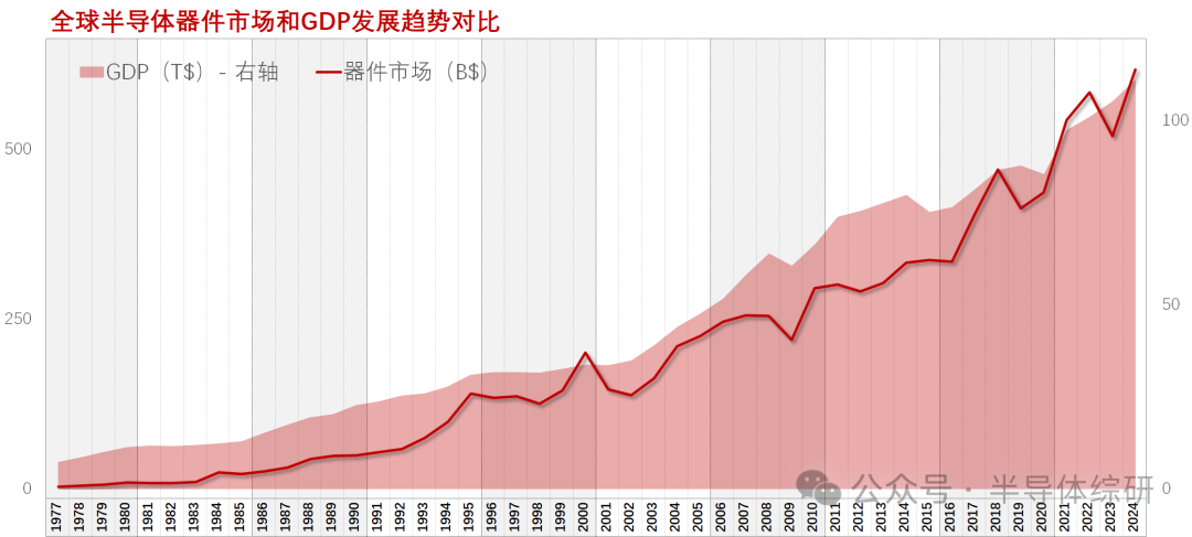 最近有新加入我知识星球的朋友让我讲讲未来半导体行业的趋势。正好最近手头也整理了不少新行业数据,那就随便讲一讲吧 最近数年,在经历了行业从高潮到低谷再到反弹的剧烈起伏折腾后,愈来愈多的朋友在和我交流时也表现出了对此的理解和认可。因此而关注我每个月发布的景气度分析和预测报告的人也越来越多了 趁此机会,我在文章开头把半导体行业发展的基本逻辑再简单讲解一下: 根据美国半导体工业协会(SIA)公布的数据,全球半导体器件的销售额从1977年的38亿美金发展到2024年的6179亿美金,差不多