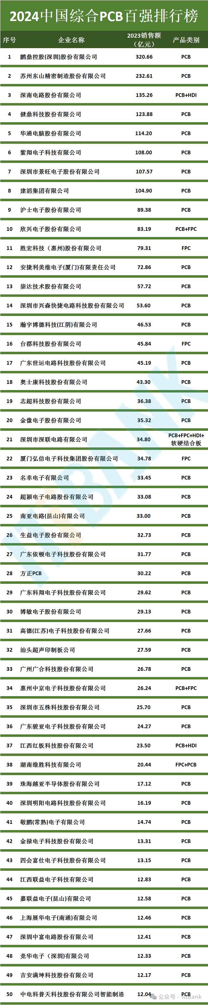 中国PCB百强(TOP 100)排行榜
